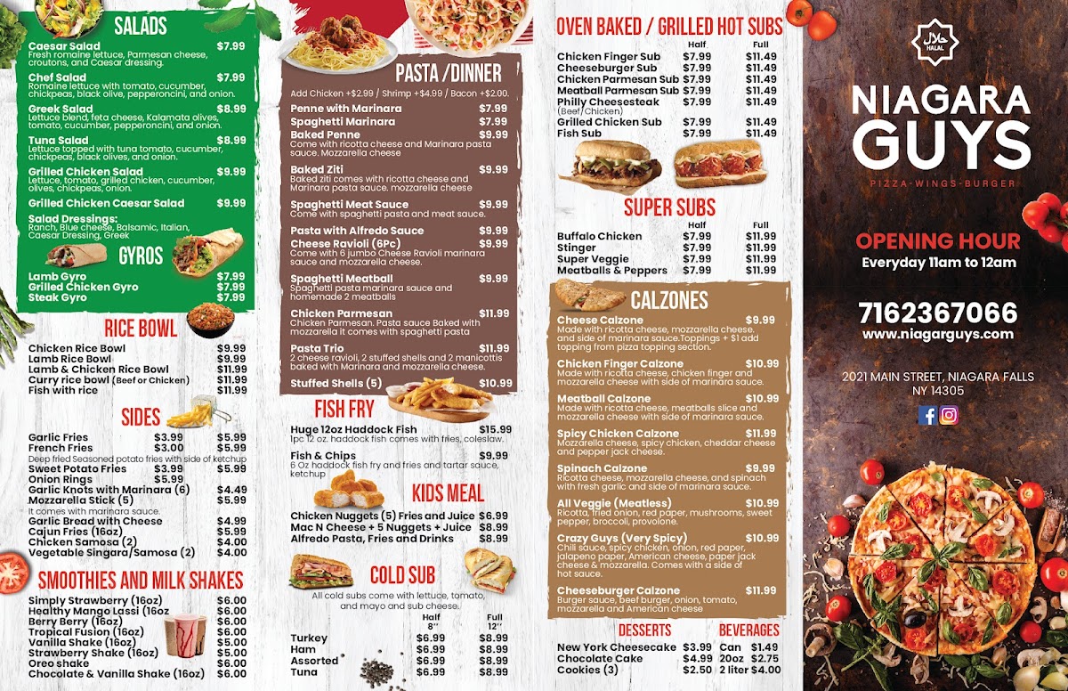 Welcome to Niagara Guys, a hidden gem located at 2021 Main St, Niagara Falls, NY. This local eatery stands out for its diverse menu featuring traditional round pizzas, hearty burgers, and delicious oven-baked subs. Each dish is prepared fresh to order, ensuring top-notch quality that customers rave about.